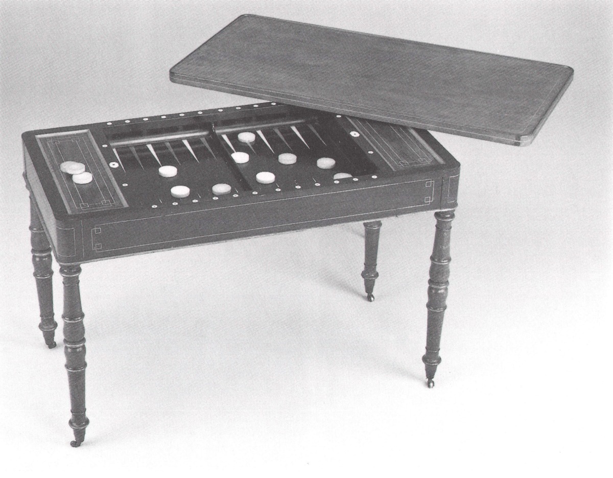 TABLE TRIC-TRAC en placage de bois exotiques et filets contrariés de marqueterie de citronnier. Piètement balustre dit « en double poire », bagué de bois clair, à roulettes. Le plateau mobile découvre un espace au jeu de tric-trac en placage d'ébène et d'ivoire, et deux compartiments latéraux ouvrant en ceinture. Avec jetons.