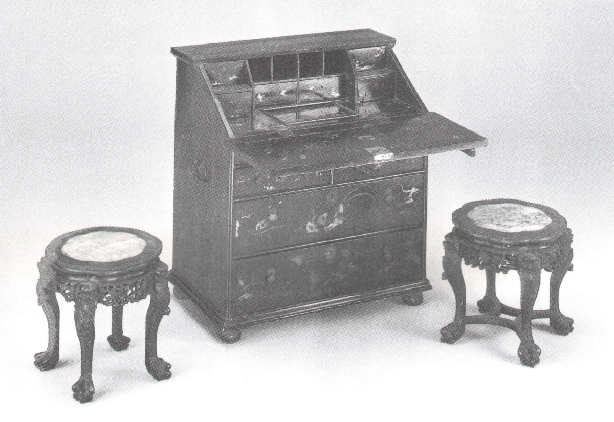 COMMODE-SCRIBAN, en bois laqué dans le goût de l'Extrême-Orient, à fond noir reposant sur quatre pieds miches. Il ouvre à un abattant et quatre tiroirs sur trois rangs. Intérieur à six tiroirs, quatre casiers et un panneau coulissant. Décor corail et or à l'orientale de scènes cynégétiques, jonques, avec semis de fleurs, grenades, loirs, insectes, coqs et poules. Plaques d'entrée de serrure mouvementées et anses en cuivre ciselé et estampé.