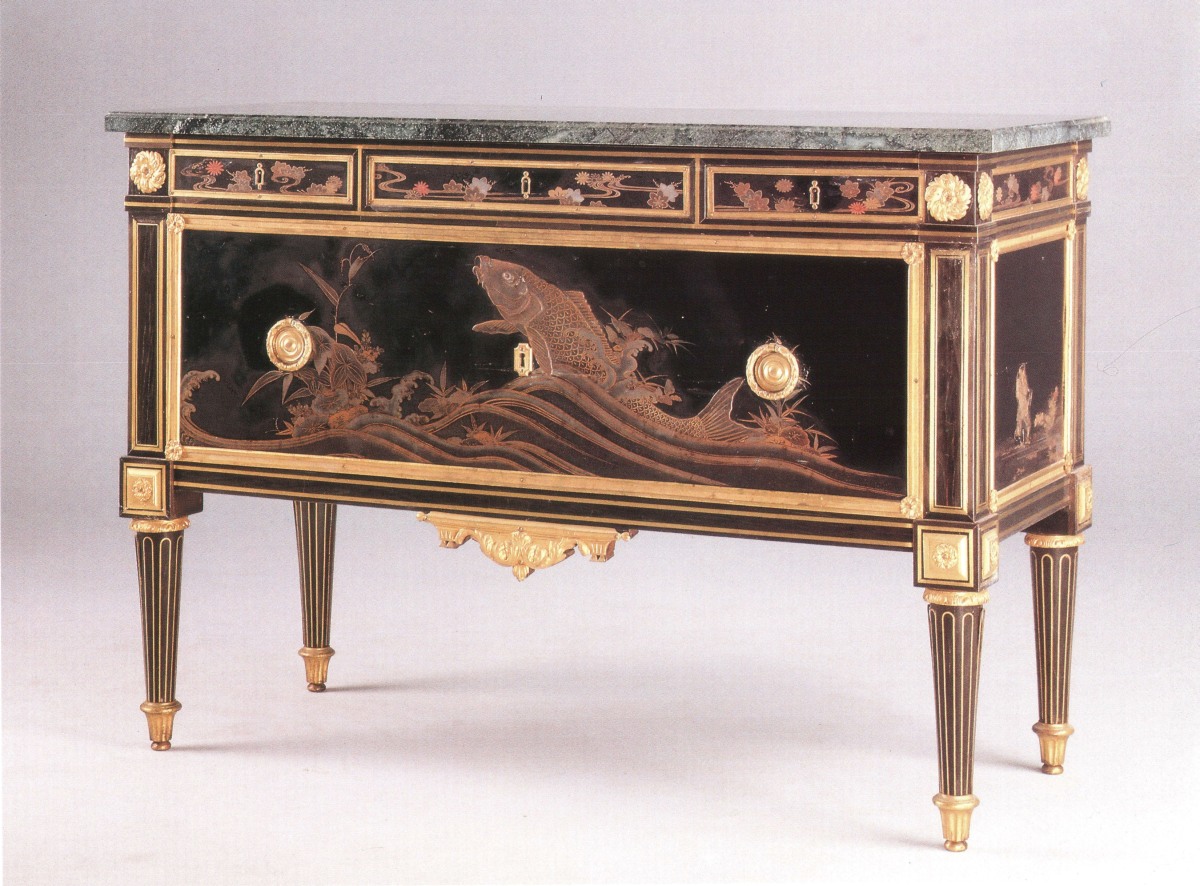 Belle COMMODE en laque du Japon à fond noir et réhauts d'or sur des reliefs, décorée en façade d'une carpe jaillissant des flots et de petits bouquets de fleurs aquatiques; sur un côté, décor d'enfants jouant au cerf-volant.