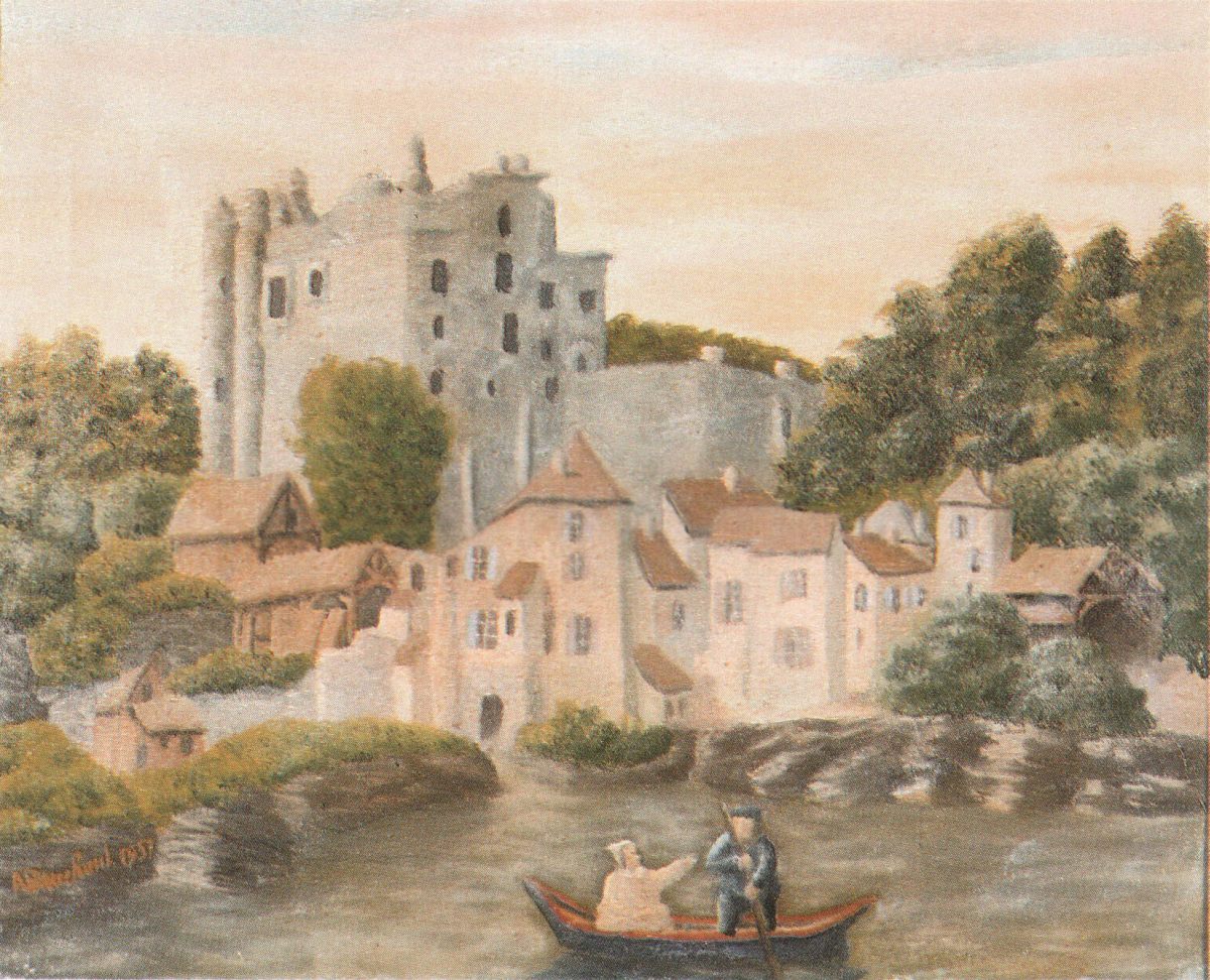 BAUCHANT. La barque au pied du château de Clisson. Huile sur toile. Signée en bas à gauche, et datée 1951. Au dos figurent, manuscrits, le titre et « 8P », et l'étiquette de Françoise Renault-Bauchant, avec le n° 51.09.