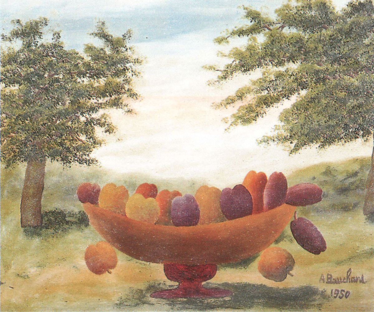 BAUCHANT. Prunes. Huile sur isorel. Signée en bas à droite, et datée 1950. Au dos figurent quatre étiquettes: la première «Bauchant Prunes 8 F, 17 A » ; la seconde, avec le n° 38 entouré; la troisième étant celle de la galerie Charpentier; la quatrième, enfin, celle de Françoise Renault-Bauchant, avec le n° 50.36. 38 × 45,9 cm.