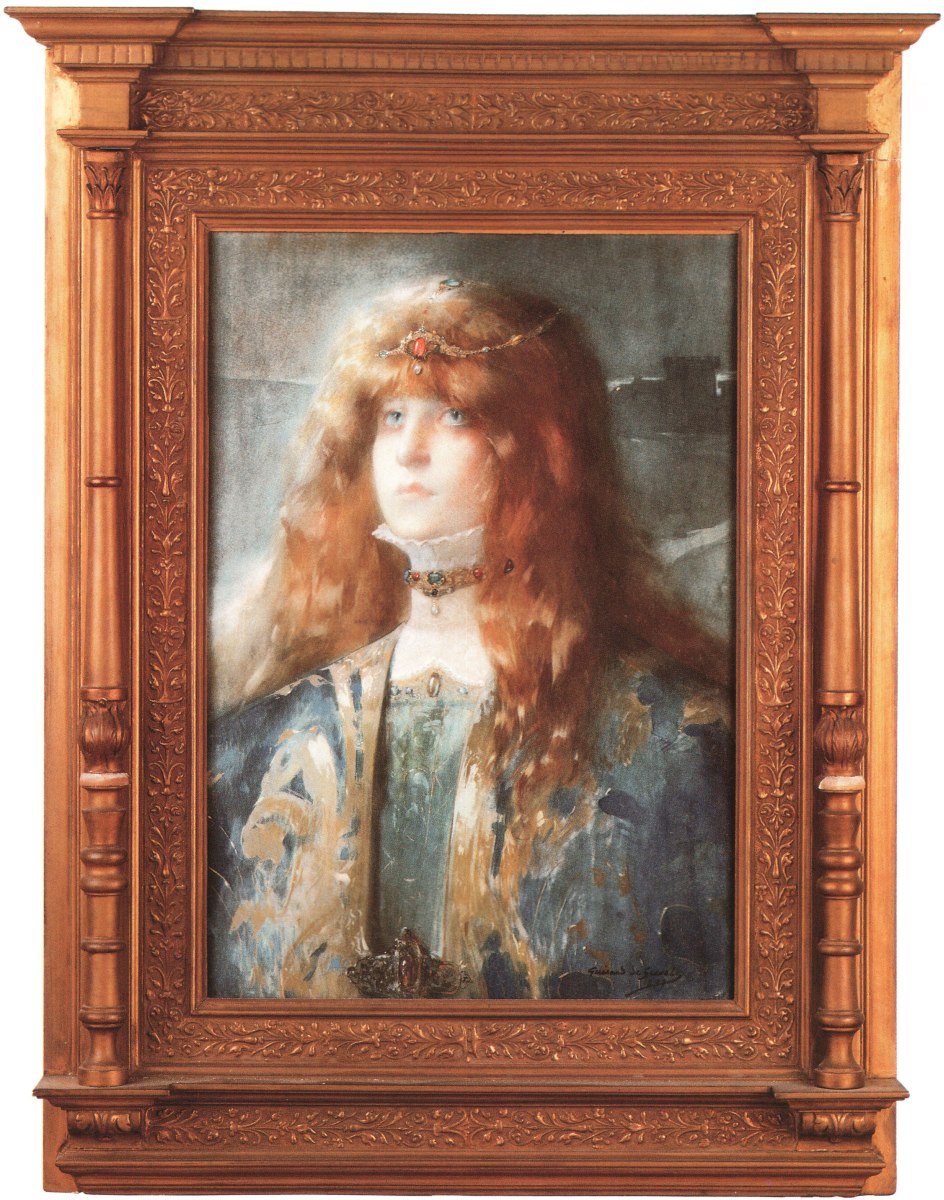 « Faisant son seul souci esthétique de l'exactitude la plus nue, Guirand de Scévola fit une brillante carrière de portraitiste mondain» (Bénézit), comme l'illustre ici ce portrait de Sarah Bernhardt, ornée de bijoux (de Lalique ?).