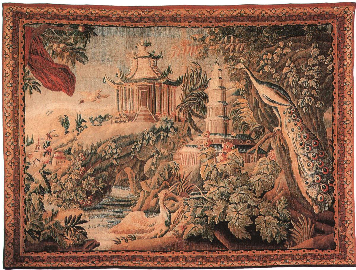 TAPISSERIE d'AUBUSSON, d'après un carton de Pillement. Scène à la pagode, avec au premier plan un paon et un héron, et derrière un palais sinisant. Bordure rapportée postérieure.