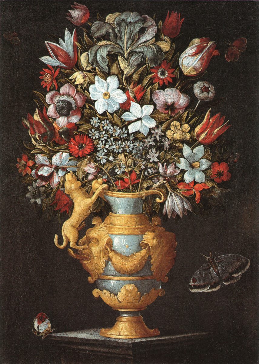 Ces éléments associés à la symétrie de l'ordonnance du bouquet et l'absence de recherche de perspective donnent à ces images un caractère archaïque qui s'explique par les influences culturelles qu'ont subies leurs auteurs. En effet, à la fin du XVIe siècle, persiste encore en Italie une tradition issue de la Renaissance qui se réfère à des modèles empruntés à des émules de l'école de Raphaël, comme les peintres décorateurs Giovanni da Udine et Polidoro da Caravaggio. Cette tradition fut maintenue par la publication en 1582 du Vasi polidoreschi avec des gravures d'Alberto Cherubini, réédité en 1610 par Egidius Sadeler, d'où certains tableaux puisent parfois leur inspiration directe. La mode de recourir à des motifs formels datant du début du XVIe siècle fut encore diffusée au cours du XVIIe siècle grâce à une série d'estampes, Les Vases, publiées en 1612 par Horatius Scopa à Naples, en même temps qu'elle trouvait un écho réactualisé avec des exemples montrés chez les peintres espagnols comme Juan van des Hamen. Peint par un artiste originaire de Lombardie, notre bouquet est à rapprocher du Vase de fleurs conservé dans une collection particulière (voir F. Zeri, La Natura Morta in Italia, Milan, vol. l, 1989, reproduit n° 232).
