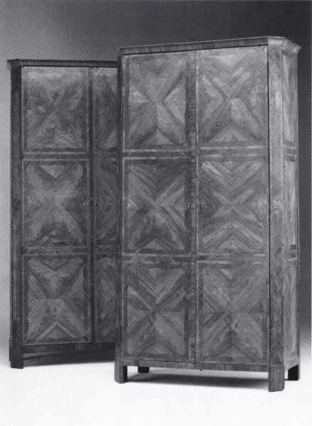 PAIRE D'ARMOIRES en placage de bois de rose marqueté en feuilles dans des encadrements de bois de violette. Elle ouvre à deux portes. Montants à pans coupés surmontés d'une corniche, socles ajourés. Entrées de serrures en bronze, à décor d'entrelacs et guirlandes de feuillages. (Petits accidents au placage et fentes. Légères différences.)