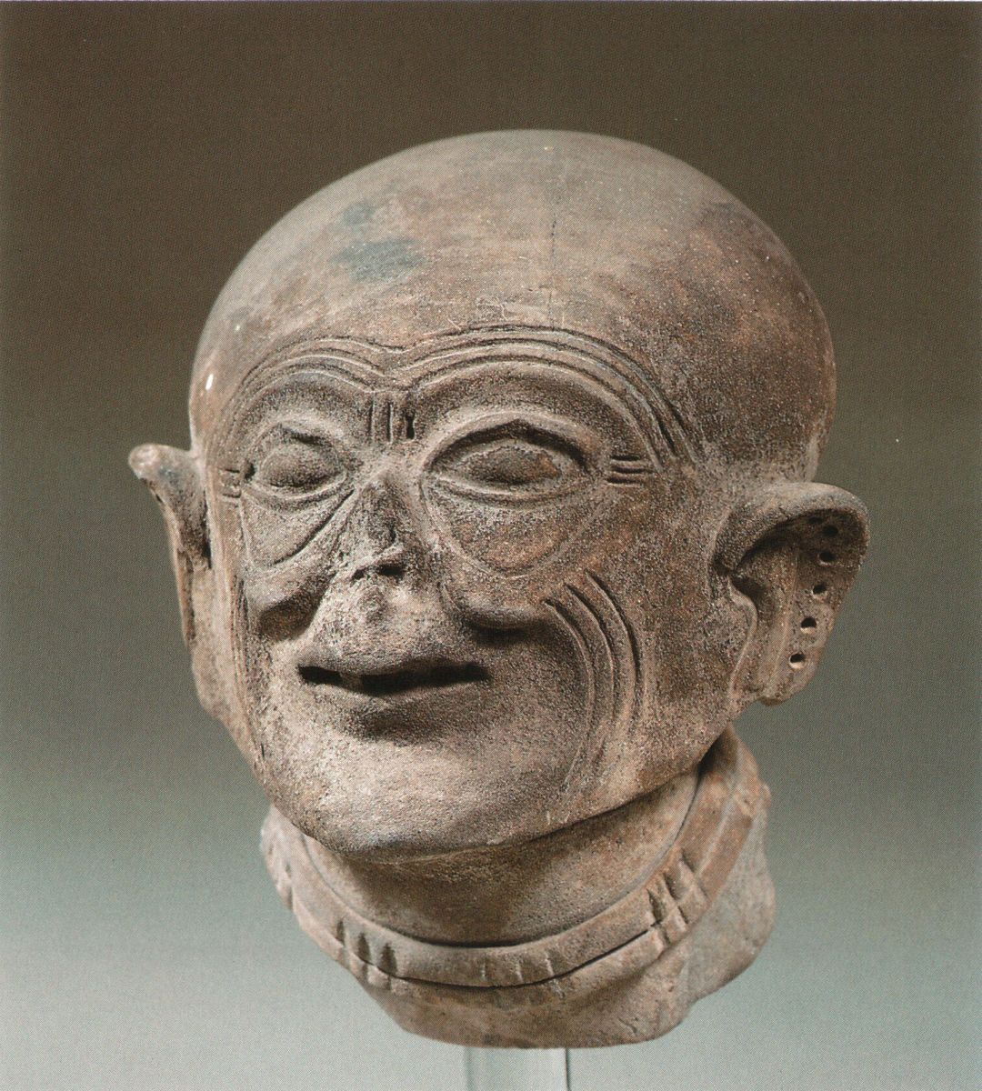 LA VIEILLESSE Céramique représentant une tête de vieillard édenté. Nez cassé non restauré. Symbole de la mort-vieillesse. Il s'agit d'une pièce majeure de l'art Tumaco. Elle a été publiée dans Tumaco. 1 000 ans d'art pré-colombien, Yves Sabolo, Office du Livre, Fribourg, 1986, et dans Tumaco-La Tolita, Jaime Errazuriz, Carlos Valencia, Bogota, 1980. Son sourire et la paix qui se dégage de cette tête illustrent de façon parfaite l'absence de peur de la mort chez les habitants de l'Amérique pré-colombienne. Cette culture est une représentation exceptionnelle de leur art.