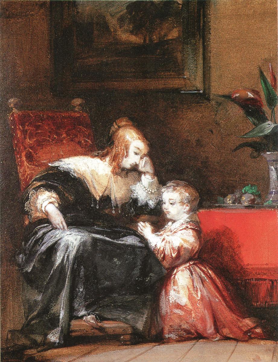 Richard Parkes Bonington a consacré une partie de son œuvre à l'histoire de France, et il a choisi ici de représenter un moment d'intimité entre Anne d'Autriche et son fils, le futur Louis XIV.