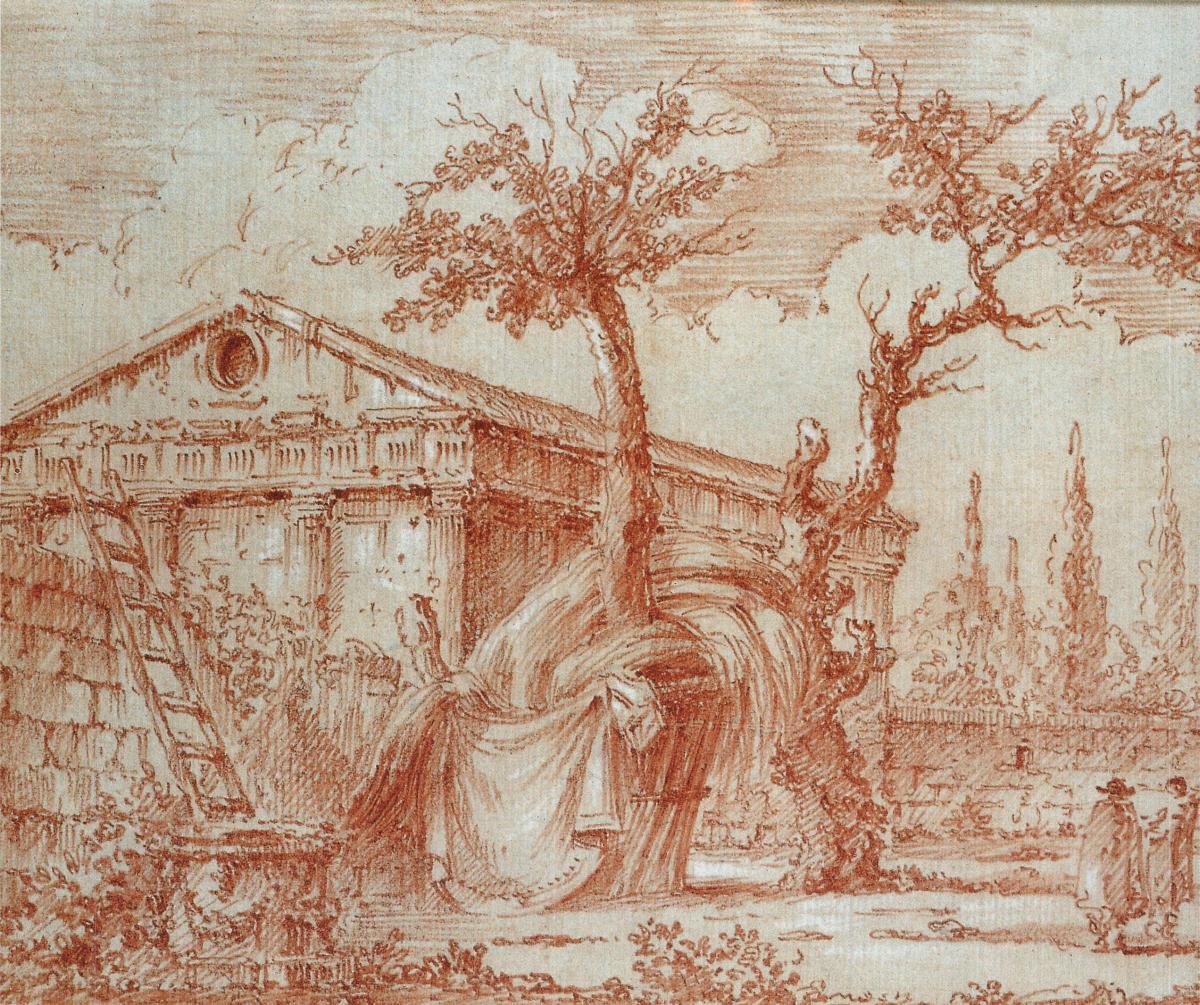 Ce dessin est à rapprocher d'un dessin qui est de composition semblable, à l'aquarelle et plume en noir, conservée au Musée Teyler à Haarlem en Hollande. Selon Jean de Cayeux, le temple est inspiré de Paestum ou l'artiste s'est rendu en 1760 (cf. J. de Cayeux, Hubert Robert et les jardins, Paris, 1987, p. 28, reproduit p. 29).