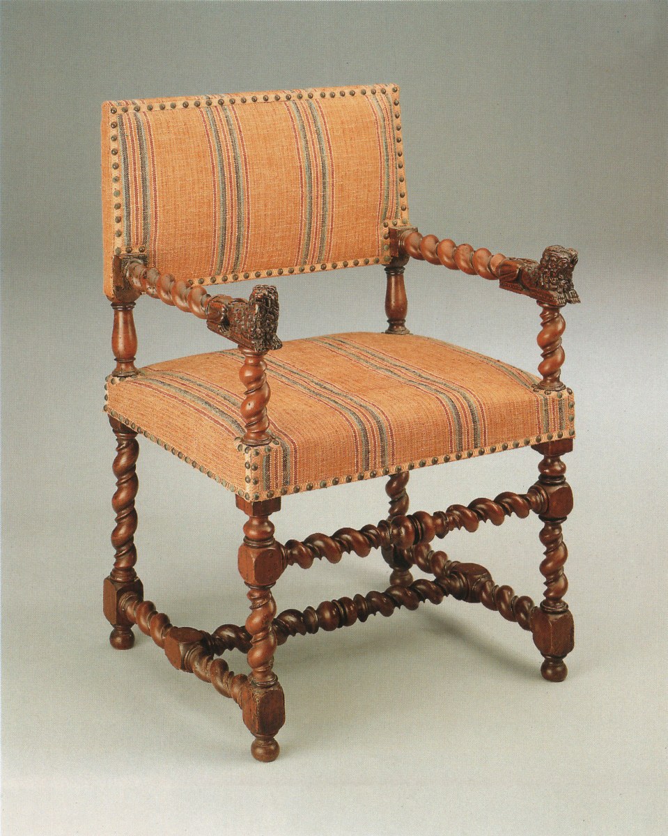 CHAISE à BRAS «aux lions couchés ». Assise et dossier garnis soutenus par un piétement noyer, réuni par une entretoise en «H» et une traverse antérieure haute. Les accotoirs sont tournés en spirale comme le piétement et sculptés à leurs extrémités de lions couchés et rugissants.