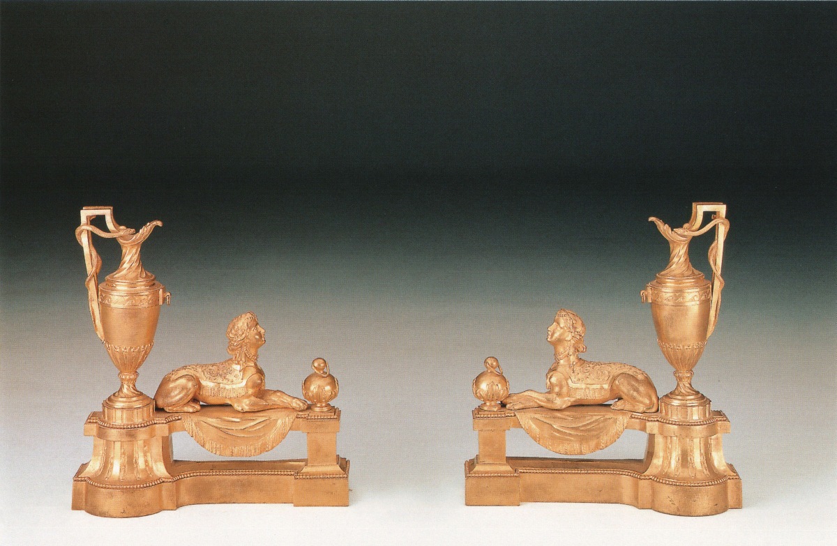 Paire de CHENETS en bronze ciselé et doré. Sur une demi-colonne cannelée repose une buire dans l'anse de laquelle s'enroulent deux serpents et dont la panse est ornée d'une frise de postes et de feuilles de lotus. Sur le recouvrement, une sphinge portant un riche carapaçon est assise devant un boulet en feu.