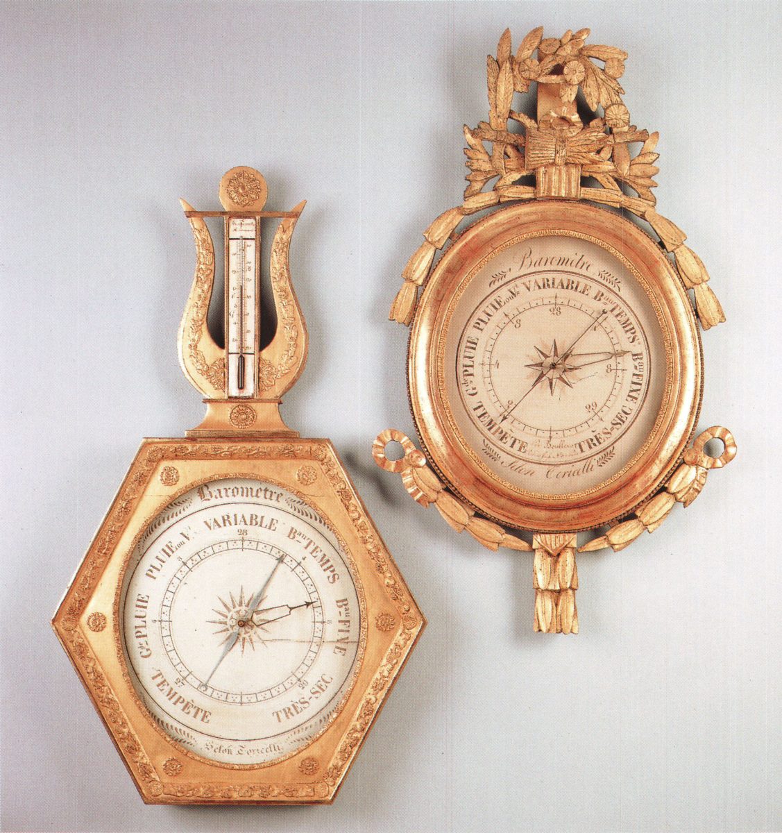 BAROMÈTRE en bois sculpté et doré. Lunette ovale surmontée d'un trophée à jours de gerbe de blé, de rameaux fleuris et d'outils de jardinage et cernée de tores de lauriers et de nœuds. Cadran signé de Boulies, rue des Juifs n° 5, à Paris.