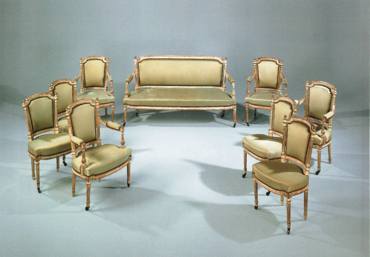 Dossiers trapézoïdaux, légèrement cintrés à « chapeaux de gendarme », encadrés de colonnettes cannelées et détachées, surmontés de vases godronnés. Accotoirs dans le prolongement du dossier, soutenu par des balustres cannelés, raccordés à la ceinture par leur base, en retrait du piétement. Roulettes.
