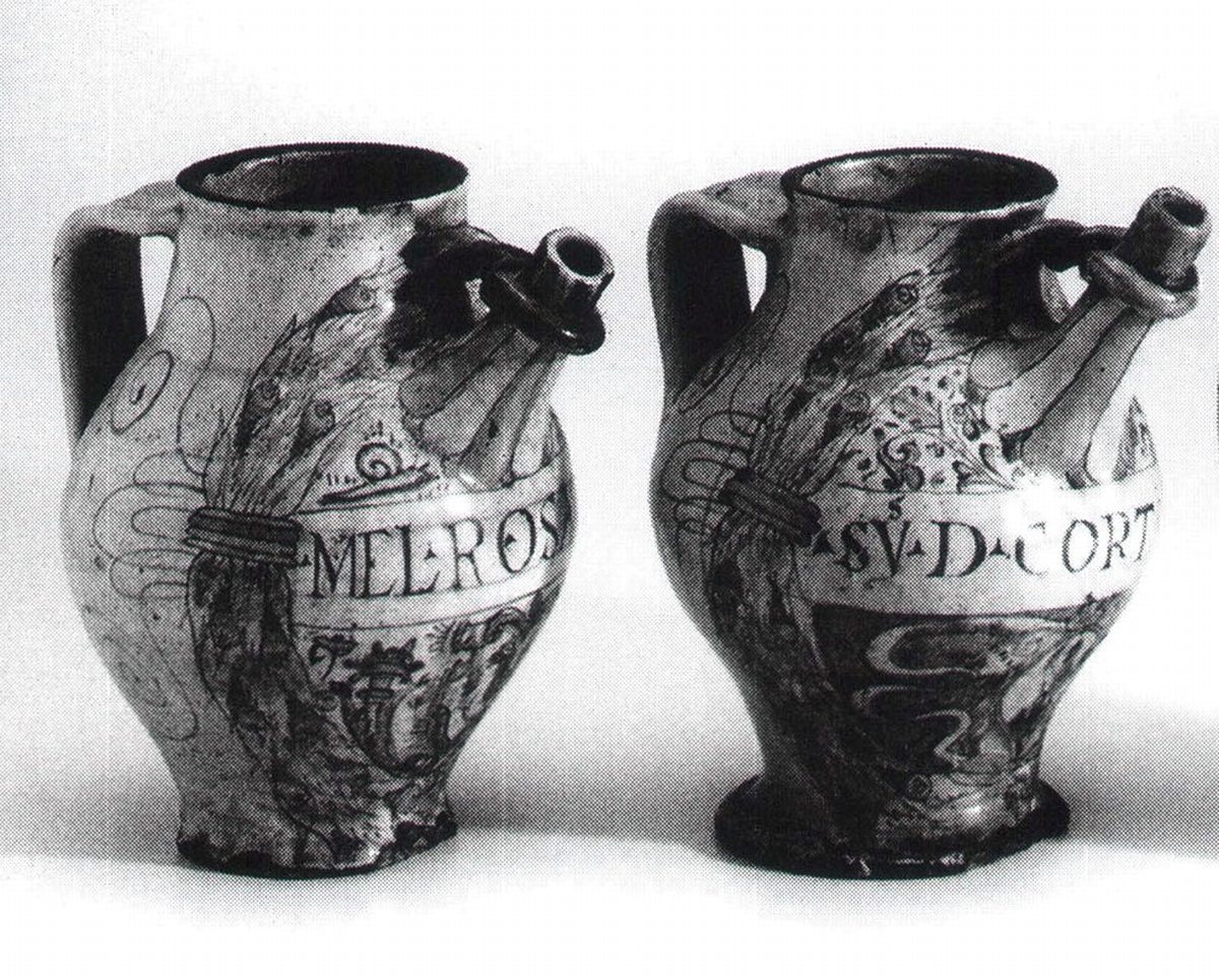 PAIRE DE CHEVRETTES en faïence polychrome, à décor de grand feu, d'un cuir découpé orné d'un coq en son centre, de poissons, de feuillages pour l'une et d'escargot pour l'autre. Inscriptions: « MEL ROSATO » pour l'une.