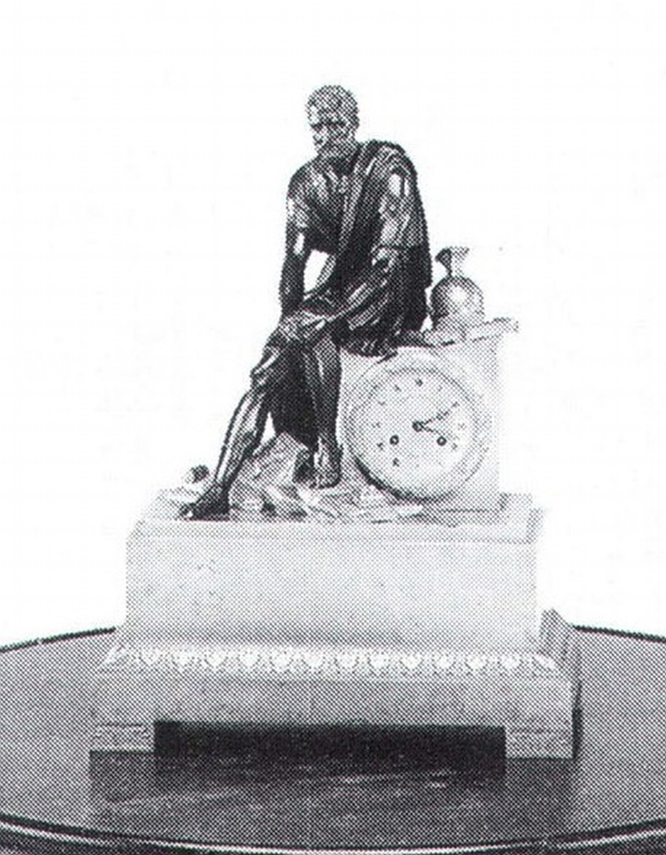 PENDULE BORNE à personnage, en bronze doré et patiné, figurant Scipion en soldat romain sur les ruines de Carthage, casque et glaive. Le cadran à chiffres romains est entouré d'une couronne de feuilles de chêne. La base est ornée d'une frise de feuilles d'eau. Pieds droits à décor d'une rosace entourée de palmettes. Cadran signé LEDURE bronzier et HEMON horloger.