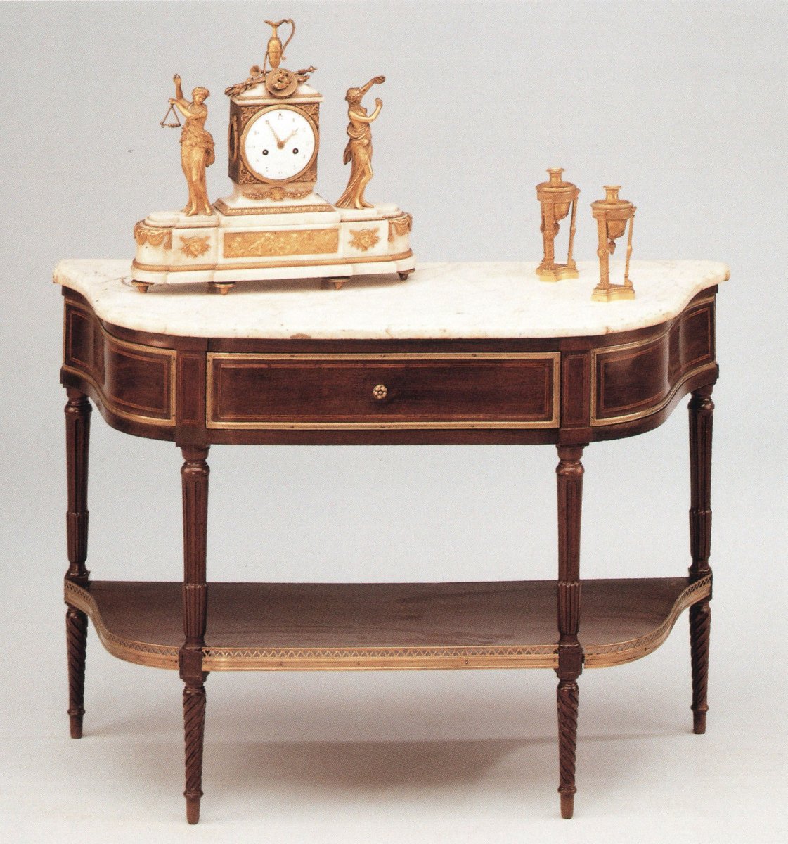 CONSOLE en acajou et placage d'acajou à façade droite et côtés mouvementés. Elle ouvre à un tiroir en façade et repose sur des montants balustres cannelés. Pieds à cannelures torsadées. Marqueterie de filets de bois clairs formant des encadrements. Ornements en bronze doré formant bouton de tirage, baguettes d'encadrement et galerie ajourée. Plateau de marbre blanc.