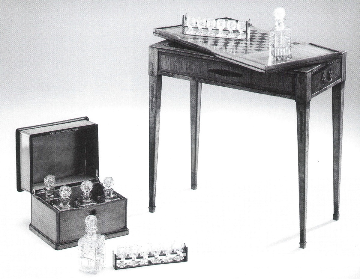 BUREAU-TABLE A JEU en bois de placage, bois de couleurs, filets de marqueterie, ouvrant à deux tiroirs latéraux. Plateau escamotable, double face, marqueté d'un damier. Il découvre un plateau orné d'un cuir doré au fer. Pieds gaines.