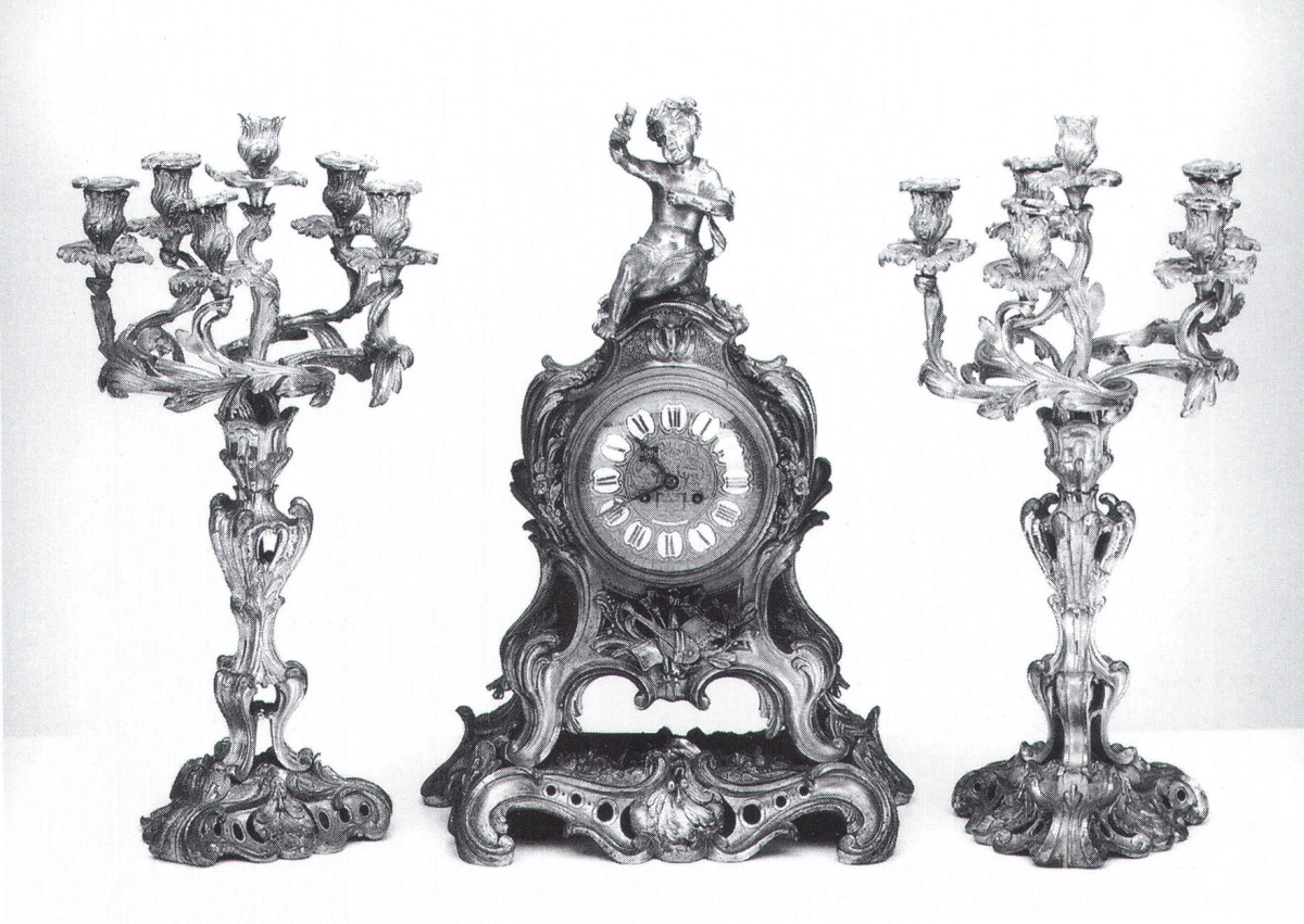 GARNITURE DE CHEMINÉE en bronze doré et ciselé, de forme mouvementée, à décor rocaille d'enroulements, de feuilles d'acanthe, de fleurs, et de volutes feuillagées. Le cartel, juché sur un socle feuillagé, est surmonté d'un amour au bouquet de fleurs assis sur un rocher. Il est orné d'un trophée à la Musique. Le cadran est en bronze doré à chiffres romains émaillés.