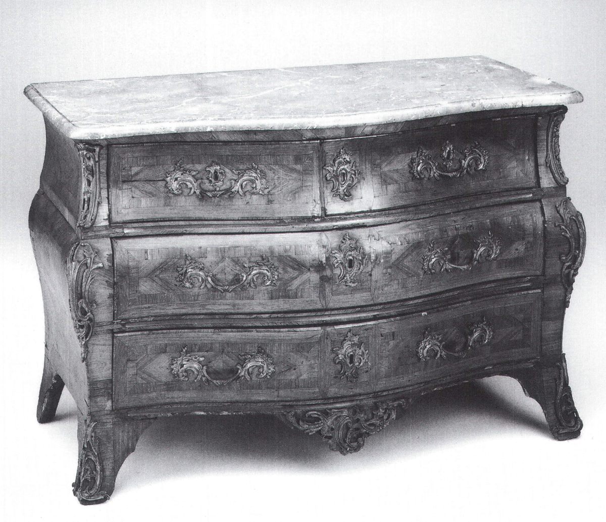 Ornementation de bronzes ciselés et dorés en forme de volutes feuillagées, feuilles d'acanthe, fleurs et agrafes : chutes, poignées de tirage, entrées de serrures, sabots.