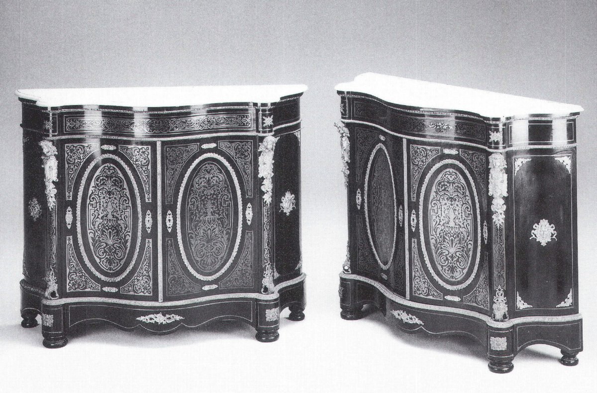 PAIRE DE MEUBLES D'ENTRE-DEUX en bois noici, à façade en arbalète et côtés galbés. Bandeau et portes à marqueterie «Boulle» de cuivre, à décor de : rinceaux, palmes, feuillages, vases à l'antique et grappes de raisins. Riche décor en bronze doré de rosaces, mascarons, frises de feuillages formant médaillons, coquilles, enroulements et d'enfants formant chutes. Ceintures mouvementées, pieds miches et plateaux de marbre blanc.