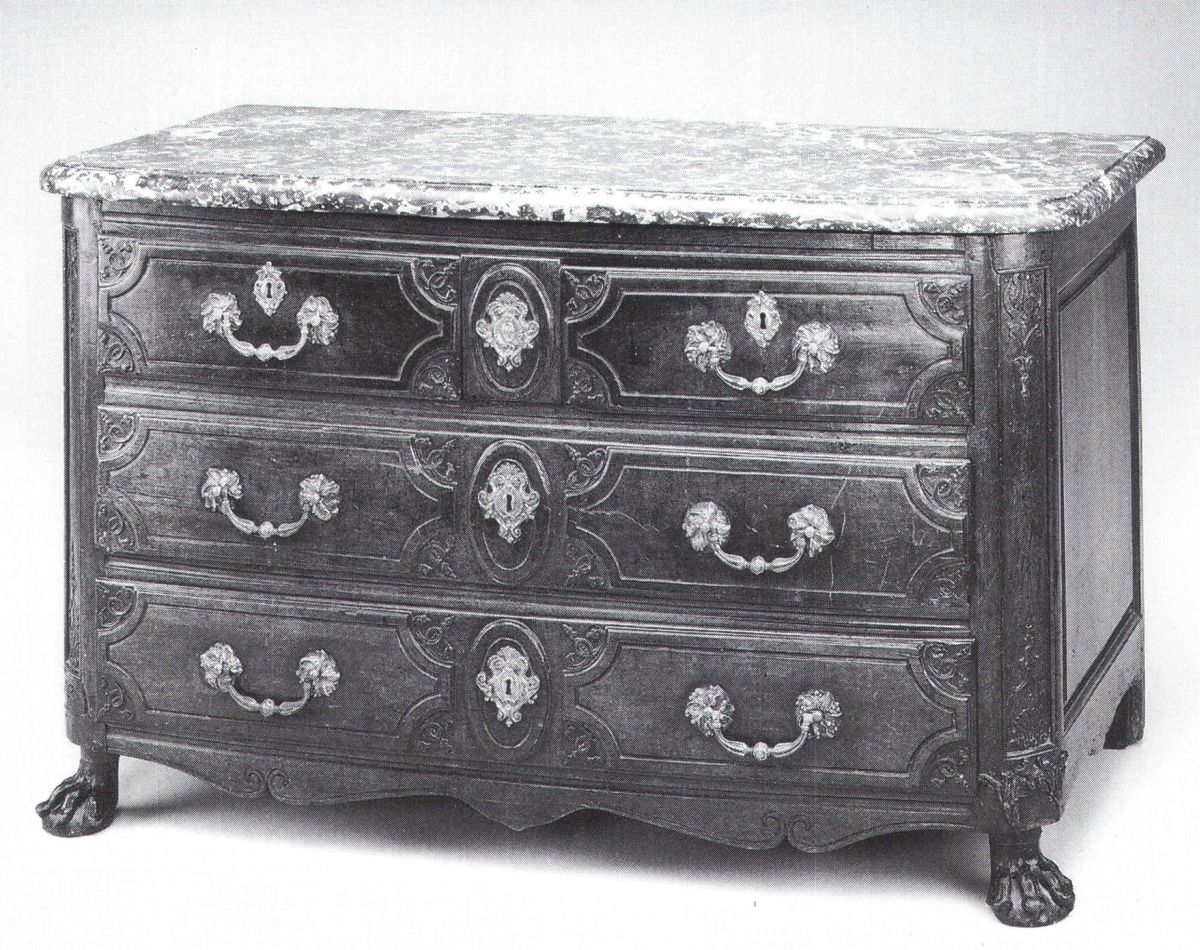 COMMODE en bois fruitier, mouluré et sculpté de coquilles, volutes feuillagées et fleurs. Elle ouvre par trois rangs de tiroirs, dont deux dans la partie supérieure. La ceinture est découpée, les montants sont arrondis et les pieds en griffes. Poignées de tirage et entrées de serrures en bronze ciselé et doré à décor de feuillages, cartouches, coquilles et volutes.