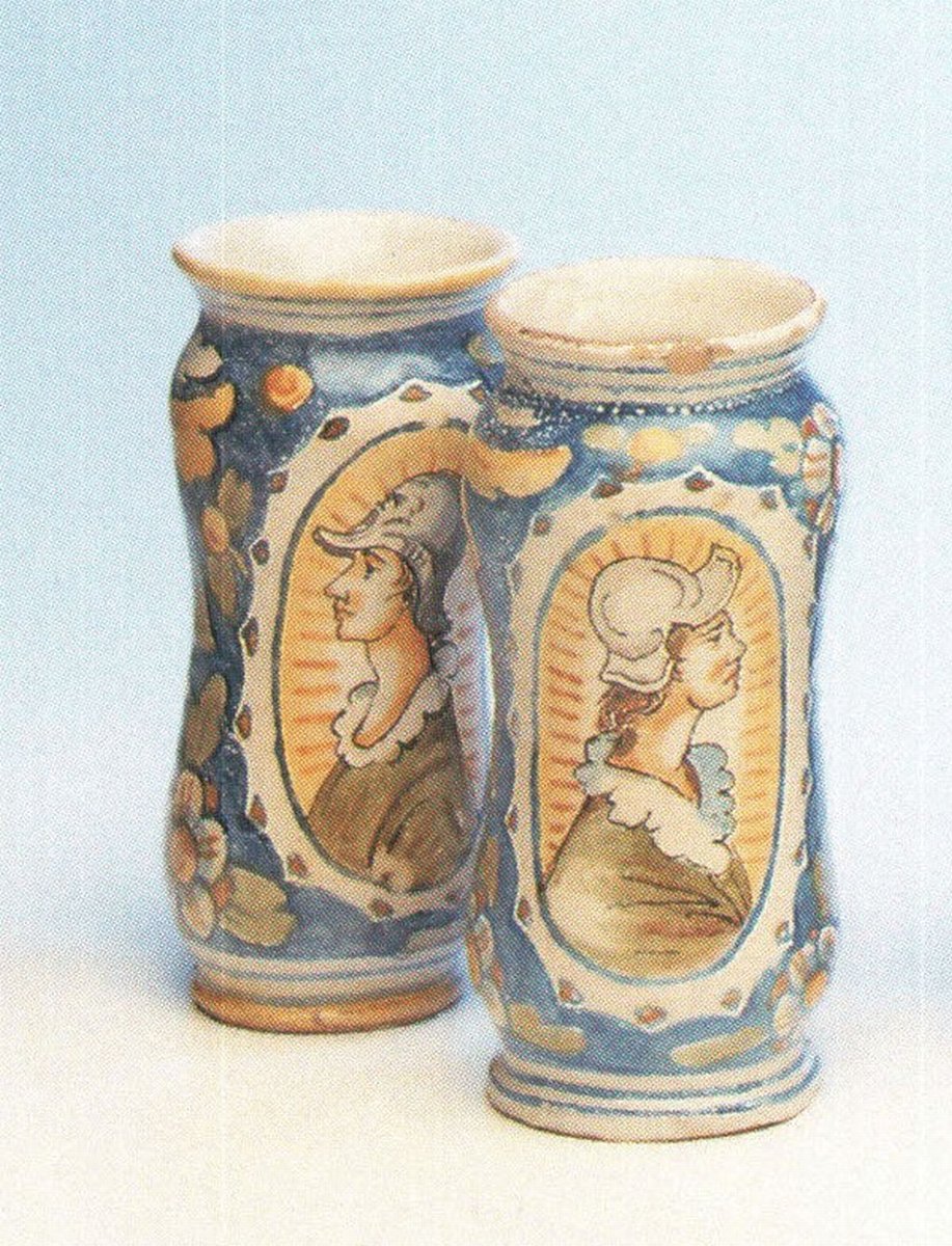 ITALIE (?). Paire d'albarelli. Décor de grand feu polychrome de fleurs et de figures dans des réserves.