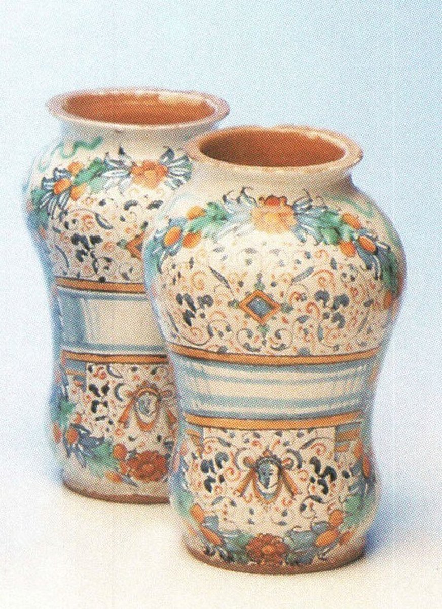 ITALIE. Paire d'albarelli, en faïence, à décor polychrome floral. Inscriptions: « 1624 ». Haut. 21 cm.