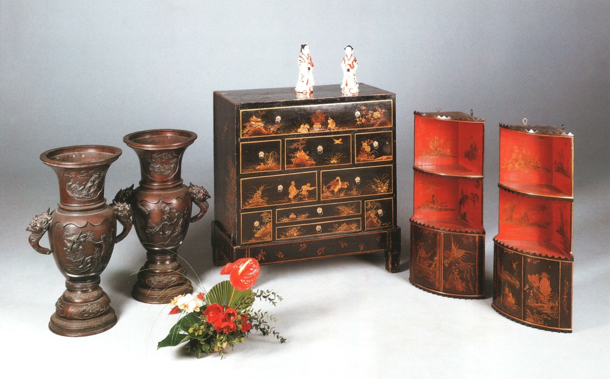 PAIRE d'ENCOIGNURES d'alcôve, en laque noir dans le goût du Japon. Elles ouvrent à deux portes en façade, coiffées de deux niches à fond rouge et décor or -également à l'imitation de l'Extrême-Orient. Elles offrent des scènes ornées d'un personnage jouant d'un instrument à cordes, d'oiseaux de paradis, de navire et pagode dans un paysage lacustre à papillons et ananas; d'arbres japonisants dans un paysage rocaille. Petite bordure à découpes festonnées.
