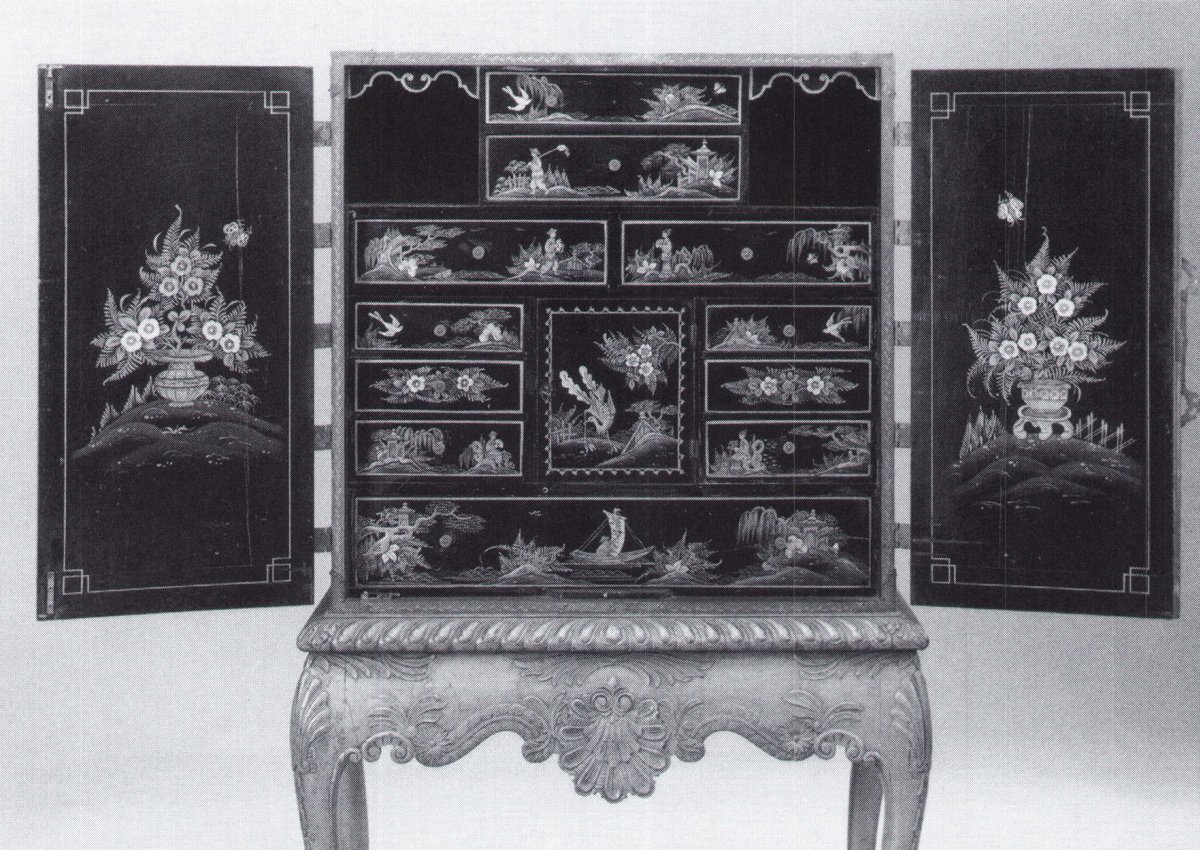 L'intérieur est également décoré dans le même esprit mais sur fond noir. Il repose sur un piétement en bois sculpté et doré de style Chippendale.