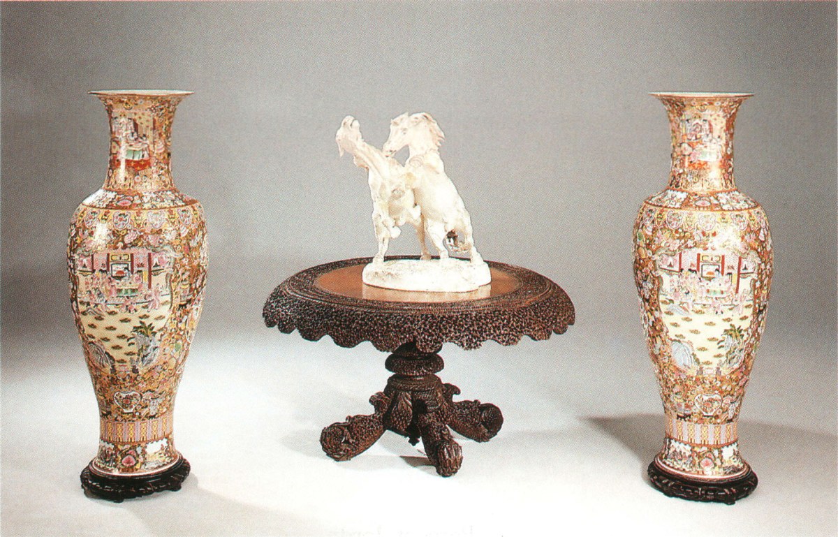 GRAND GUÉRIDON, en bois de fer, réel métissage entre le modèle occidental et l'imaginaire hindou. La composition ornementale sculptée, en frises ajourées d'arabesques tapissantes cerclées d'un rang d'oves, puise dans la flore et les symboles orientaux: palmettes, fleurs de lotus épanouies et soleils. Le plateau est dépourvu de décoration. Il repose sur un fût à couronnes ajourées, supporté par quatre consoles renversées à volutes à jours d'écailles et d'acanthes, encadrées de luxuriants fruits.