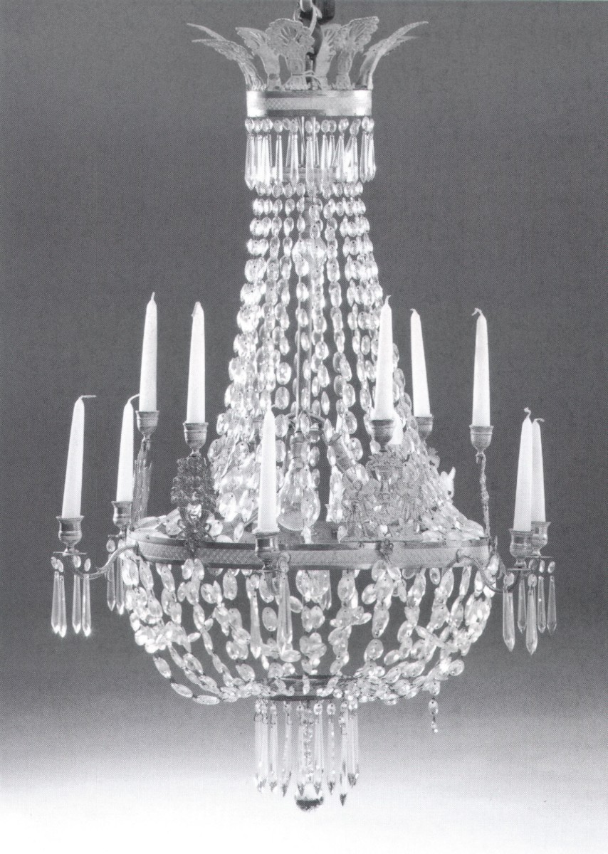 LUSTRE à 12 branches de lumières, en cristaux, à guirlandes de pampilles, boule et pendeloques. Monture en couronnes, en bronze doré, à décor de palmettes en fleurs, de carquois à guirlande de roses, et de vases de fleurs encadrés par des anges.
