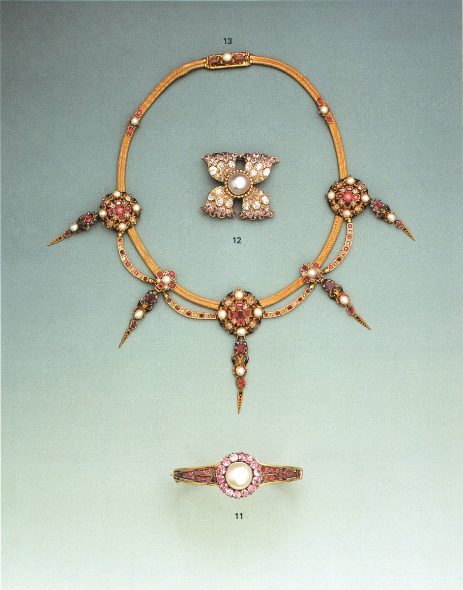 COLLIER en or jaune tressé formant draperie, orné de cinq agrafes polylobées partiellement émaillé noir, serties de rubis et perles fines retenant chacune des pampilles. Le centre souligné d'une ligne articulée également sertie de rubis et de diamants de taille ancienne alternés. Le fermoir orné d'une perle bouton entre deux petits rubis.