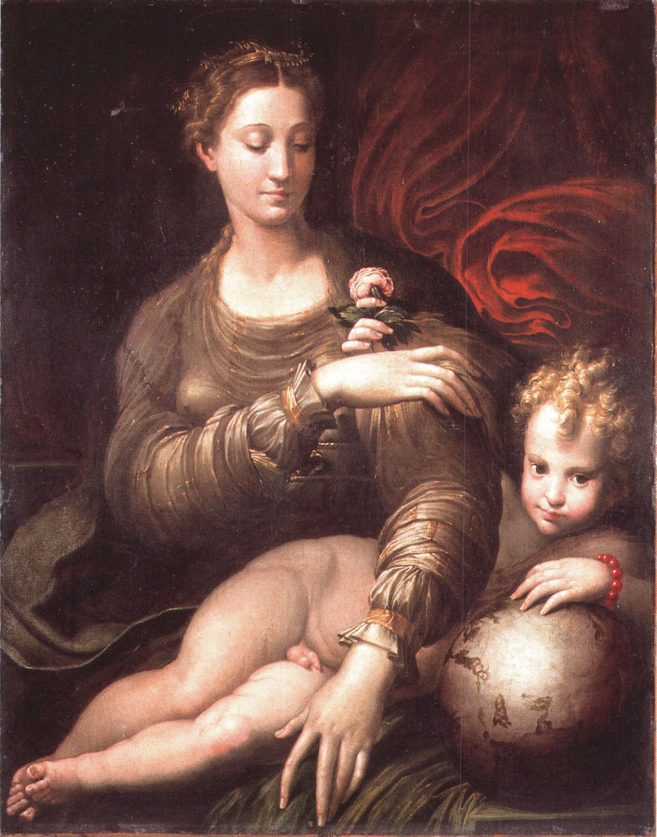 Notre tableau est une reprise de La Madone de la rose peint par Parmesan vers 1529 et aujourd'hui conservé au musée de Dresde (voir P. Rossi, L'opera completa del Parmigianino, Milan, 1980, reproduit, n° 43).