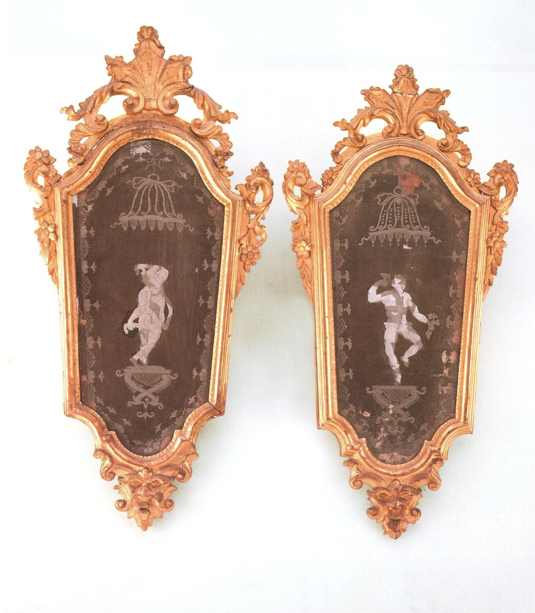 Paire de GLACES faisant pendant, en verre de Venise. Décor de Bacchus pour l'une, et d'une nymphe pour l'autre, dansant sur des consoles sous des baldaquins. Contours à décor de motifs floraux stylisés. Cadres en bois redoré ancien orné de fleurs, de motifs végétaux stylisés et de masques. (Accidents restaurations.)