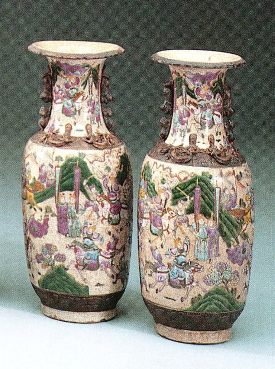 JAPON. Paire de grands VASES à long col, en céramique Satsuma. Décor polychrome sur fond craquelé, de scènes guerrières. Application de dragons en ronde-bosse.