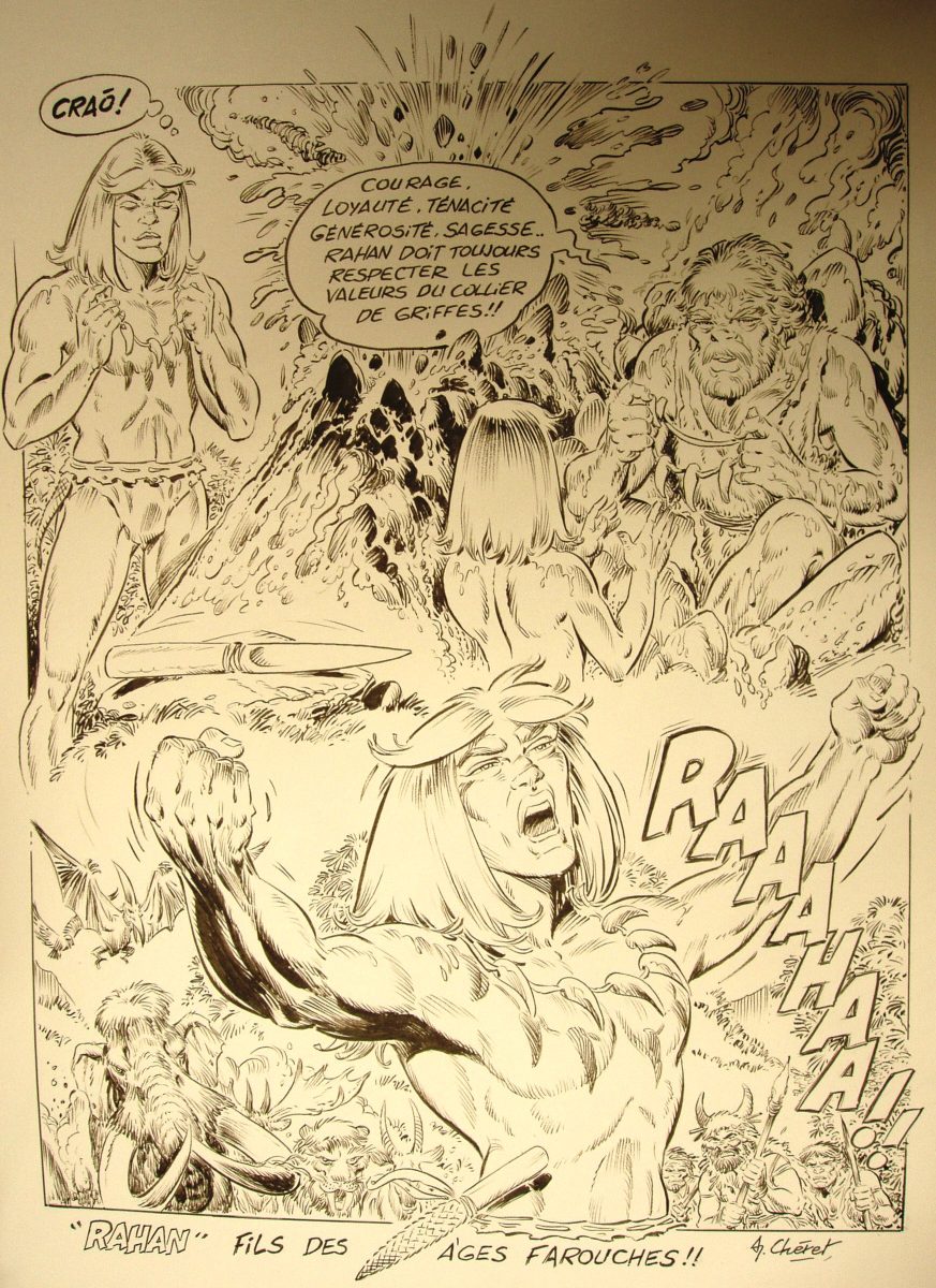 André Chéret débuta dans la vie active comme imprimeur, métier qu'il abandonna pour se consacrer à la décoration de cinéma. Le dessinateur Jean Giraux l'entraîna sur les pistes de la B.D. Il travaille à droite et à gauche, cherchant à se faire un nom et il apprit que la bande dessinée, comme tout autre art, est une longue patience. En 1968, le journal "PIF" lui confie le scénario de Rahan. Chéret a trouvé, son univers. Les cadres éclatent, le héros prend une dimension exceptionnelle. Les décors s'ouvrent. Tout un monde nait sous le pinceau magique. Chéret fait revivre une épopée fabuleuse. Ses dinosaures, brontosaures, ptérodactyles peuplent les eaux, les savanes et le ciel. Le tigre à dents de sabre est plus vrai que nature... Le crocodile géant n'eut sans doute jamais tant de férocité dans l'oeil ; Chéret réinvente la Préhistoire...