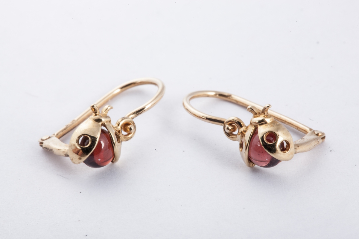 Paire de DORMEUSES en or jaune, à décor de coccinelles serties d'un cabochon de pierre fine.