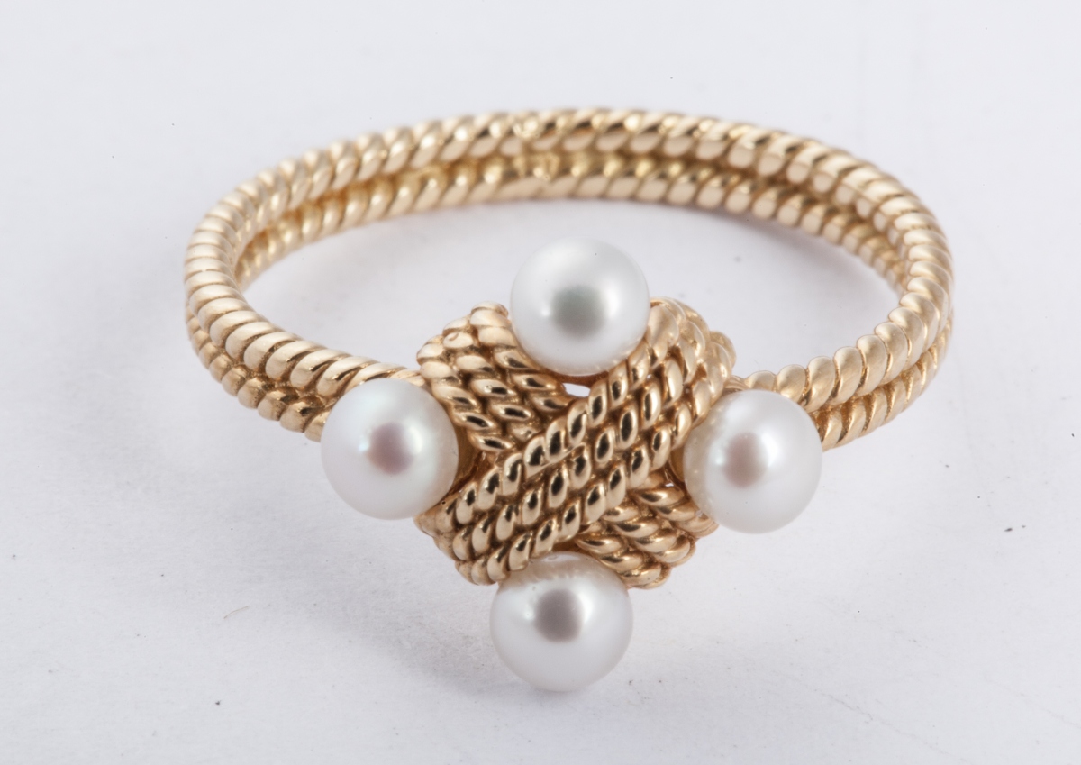 BAGUE en or jaune à décor de cordelette sertie de quatre petites perles de culture.