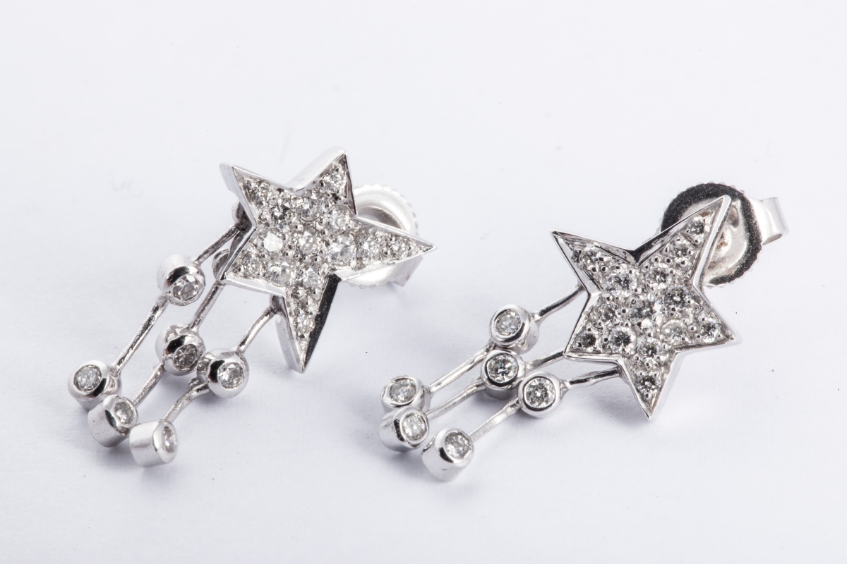 Paire de BOUCLES d' OREILLE étoiles filantes en or gris, sertie de petits diamants de taille brillant.