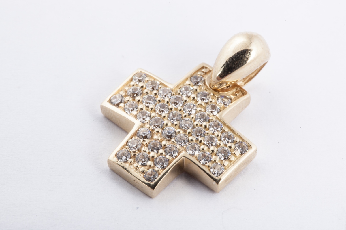 Pendentif croix en or jaune, pavé de pierres de synthèse blanches.