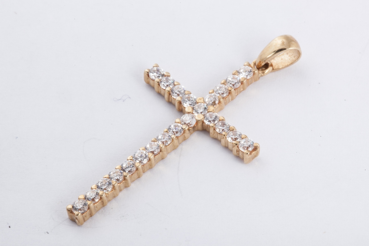 PENDENTIF croix en or jaune serti de pierres blanches d'imitation....