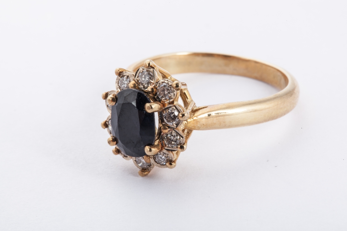 BAGUE en or jaune, sertie d'un saphir dans un entourage de petits brillants.
