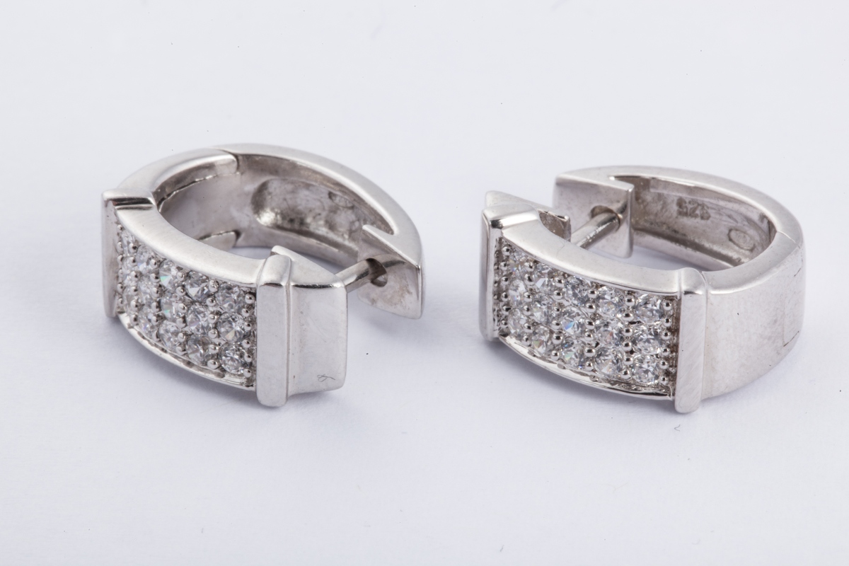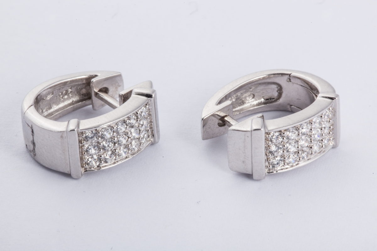 Paire de BOUCLES d' OREILLE, système pour oreilles percées, en argent, ornée d'un pavage de pierres de synthèse blanches.