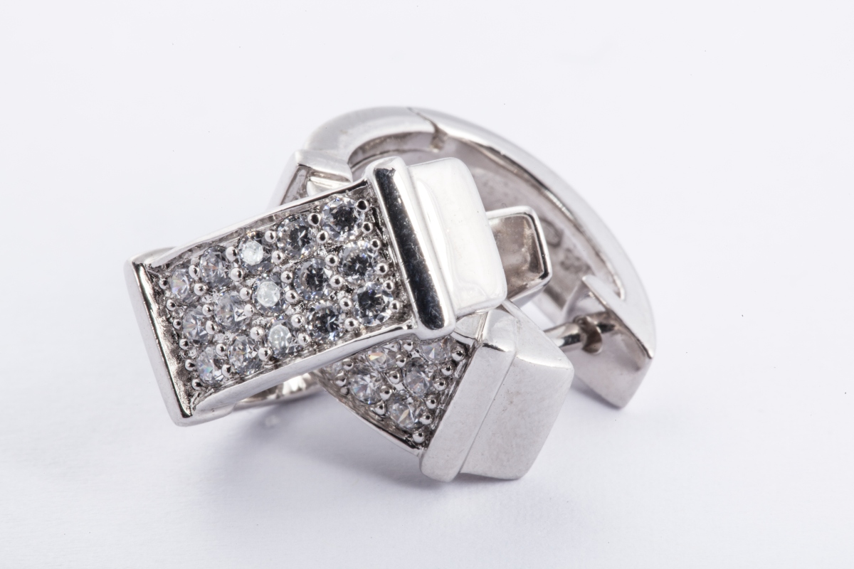 Paire de BOUCLES d 'OREILLES, système pour oreilles percées, en argent, sertie de pierres de synthèse blanches.