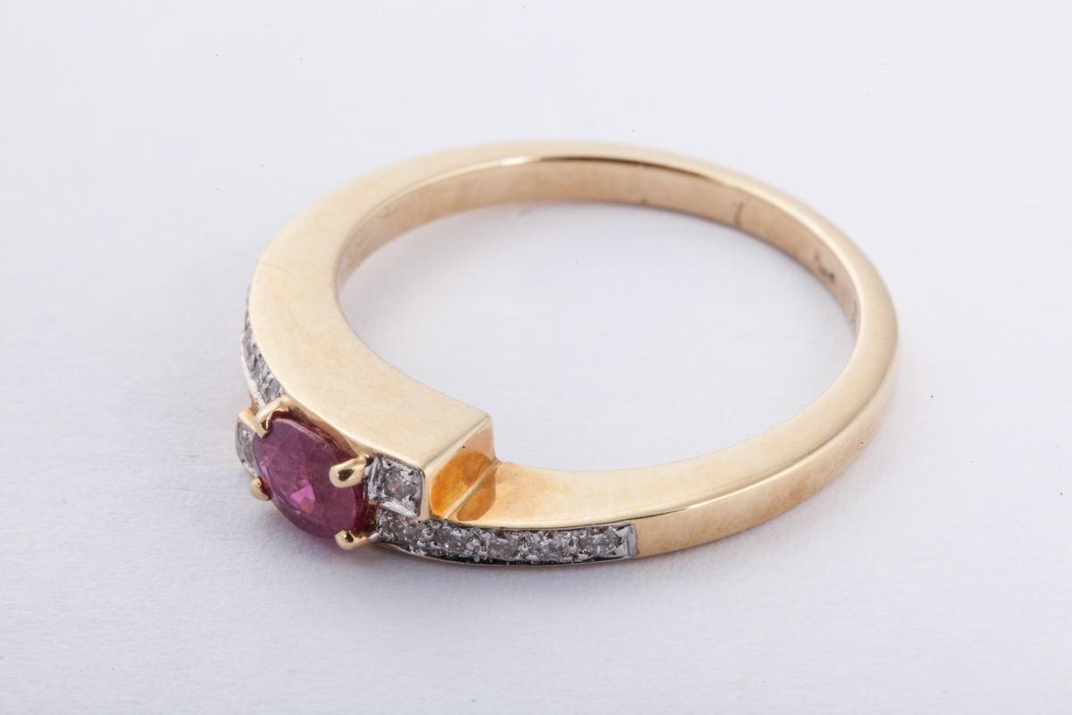 BAGUE en or jaune ornée d'un rubis ovale entre deux lignes de diamants.