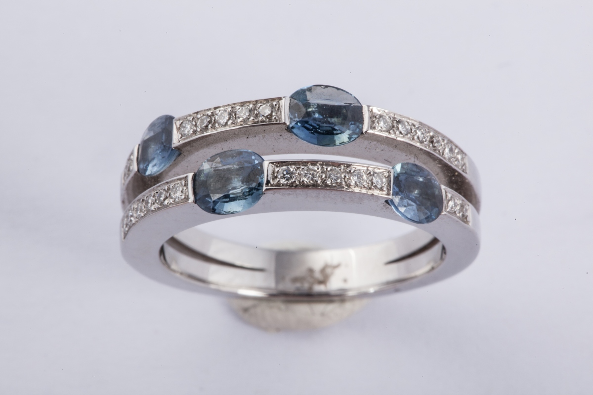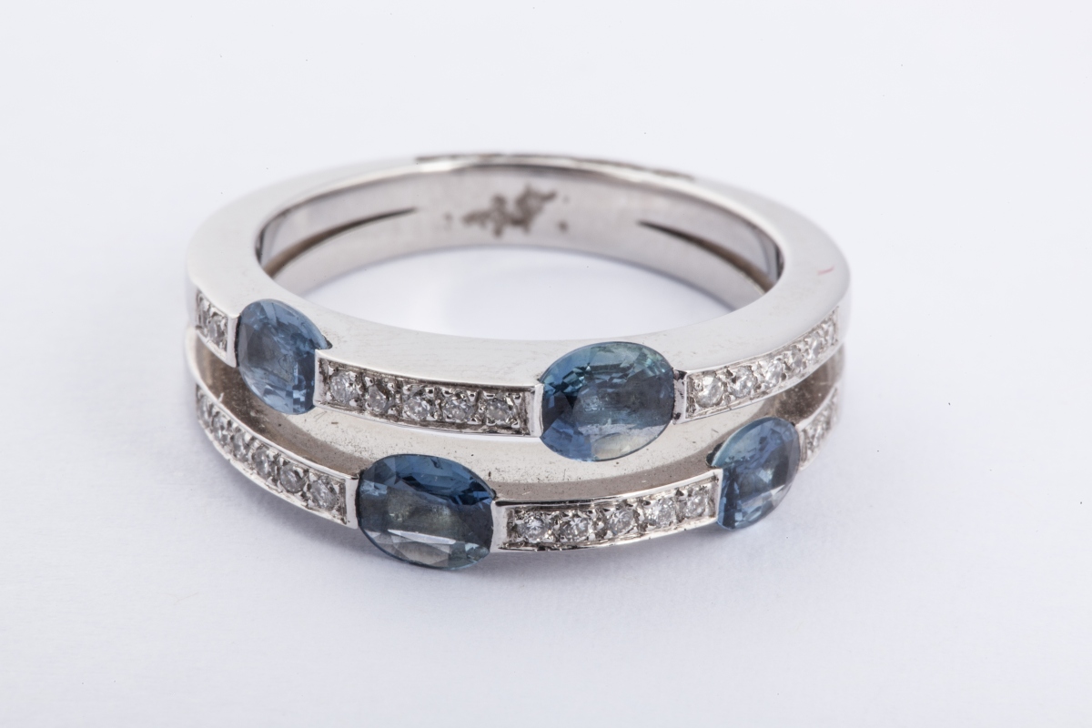 BAGUE deux corps en or gris, sertie de quatre saphirs ovales entre des lignes de petits diamants.