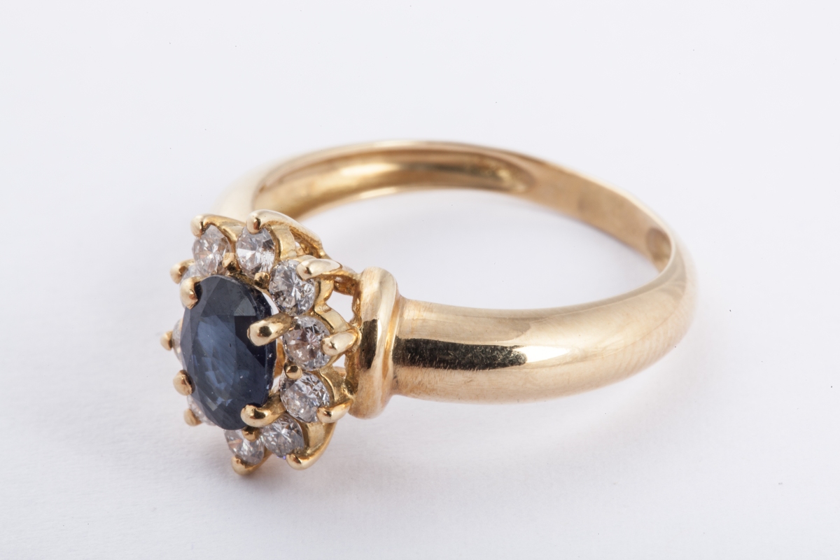 BAGUE en or jaune sertie d'un saphir de forme ovale dans un entourage de dix brillants.