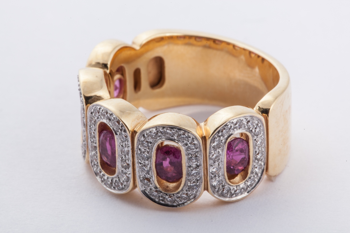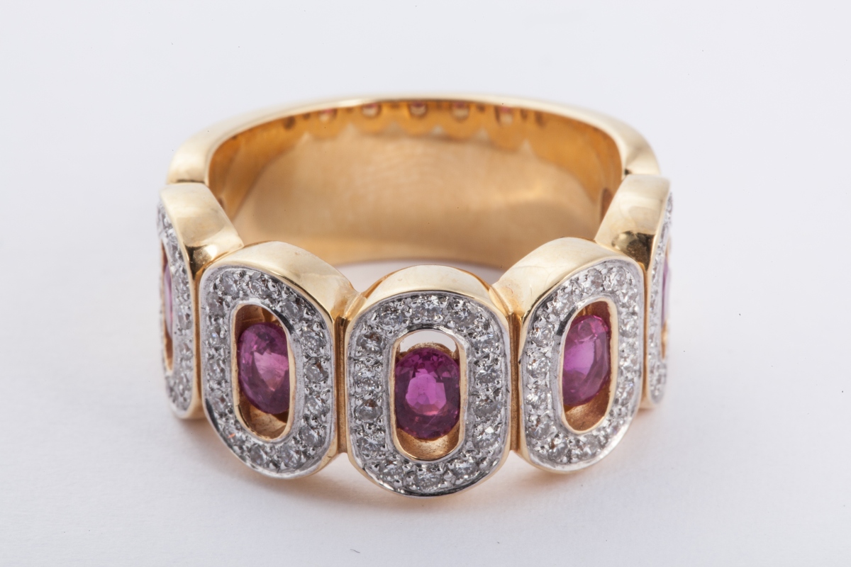 BAGUE en or jaune ornée de cinq rubis ovales dans des entourages de brillants.