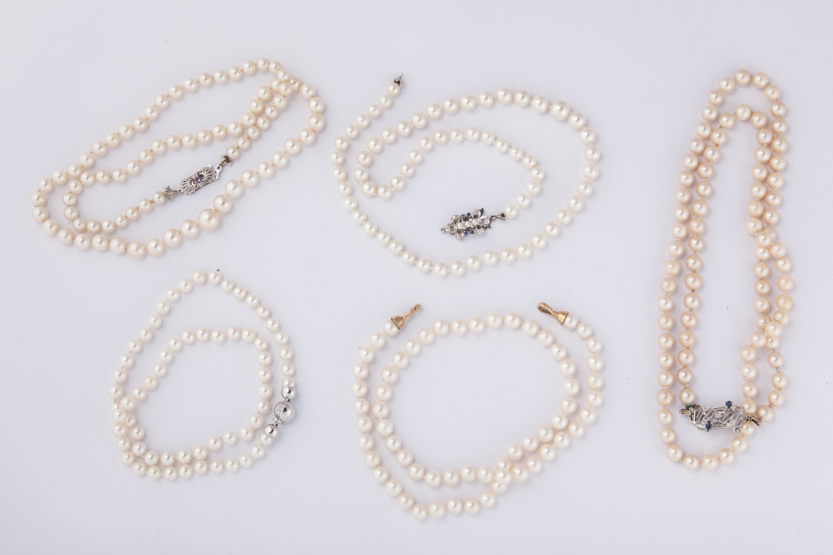 Lot de CINQ COLLIERS de perles de culture en chute,...