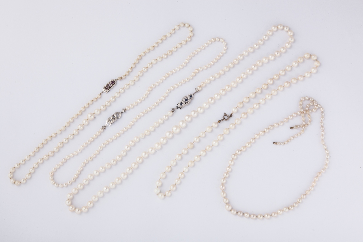 Lot de CINQ COLLIERS de perles de culture en chute,...