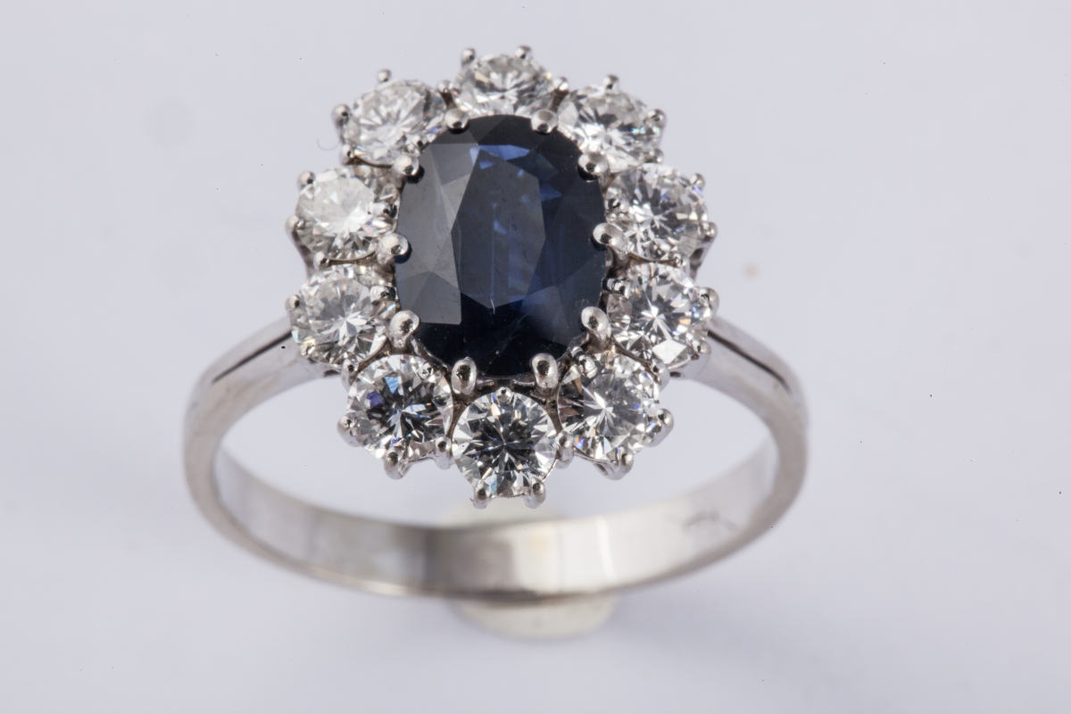 BAGUE en or gris, sertie d'un saphir ovale dans un entourage de dix brillants.